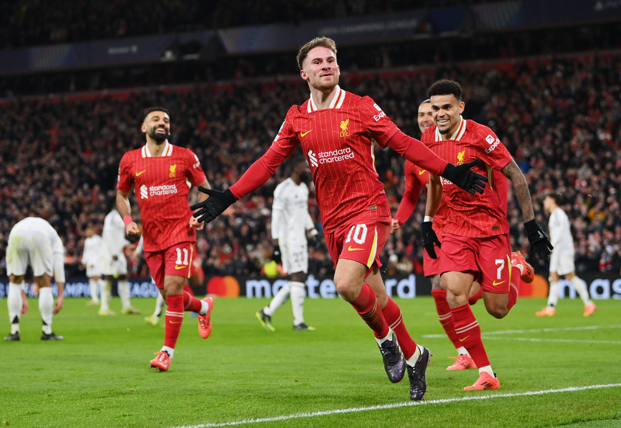 LIVERPOOL, ENGLAND - NOVEMBER 27: Alexis Mac Allister of Liverpool celebrates scoring his team's first goal during the UEFA Champions League 2024/25 League Phase MD5 match between Liverpool FC and Real Madrid C.F. at Anfield on November 27, 2024 in Liverpool, England. (Photo by Justin Setterfield/Getty Images)