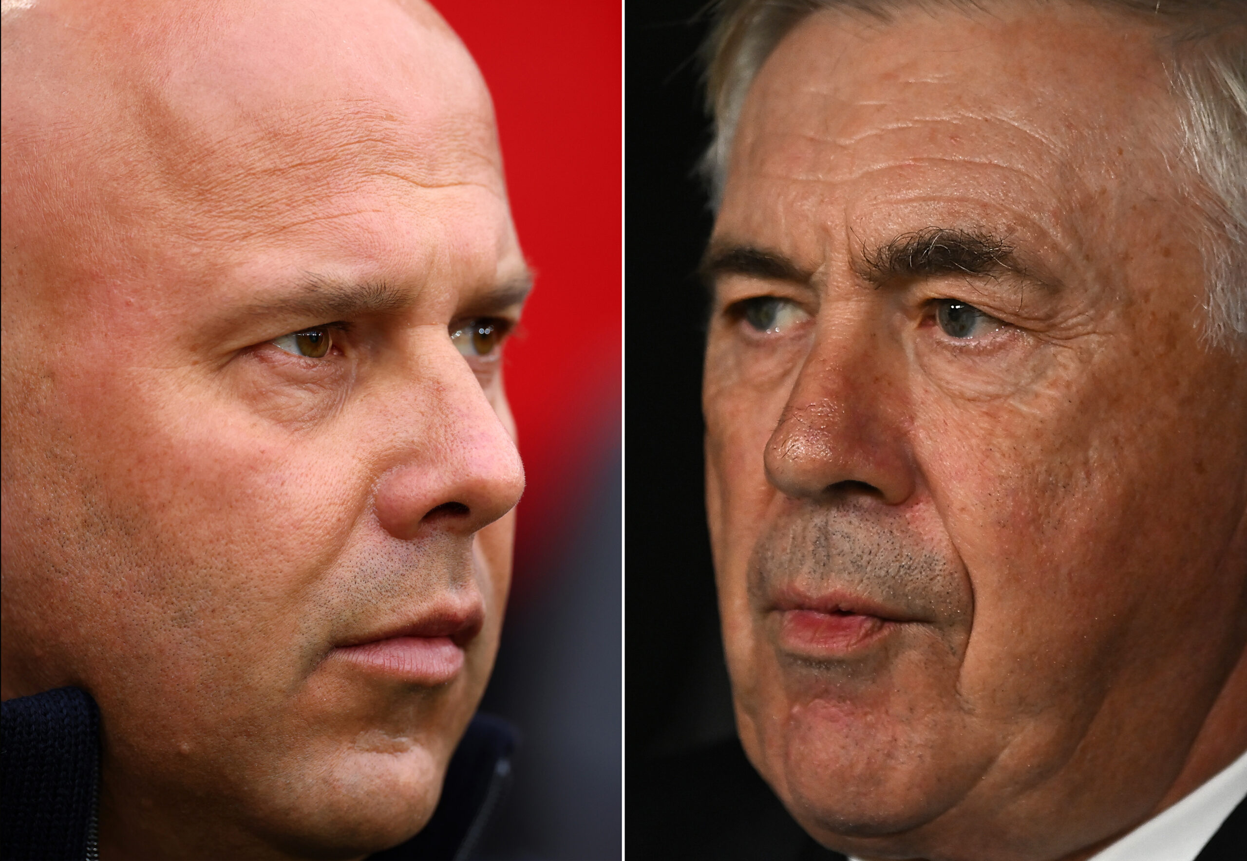 FILE PHOTO (EDITORS NOTE: COMPOSITE OF IMAGES - Image numbers 2186625880, 2183886797) In this composite image a comparison has been made between Arne Slot, Manager of Liverpool (L) and Carlo Ancelotti, Head Coach of Real Madrid. Liverpool and Real Madrid meet in a UEFA Champions’ League group match on November 27,2024 at Anfield in Liverpool, England.