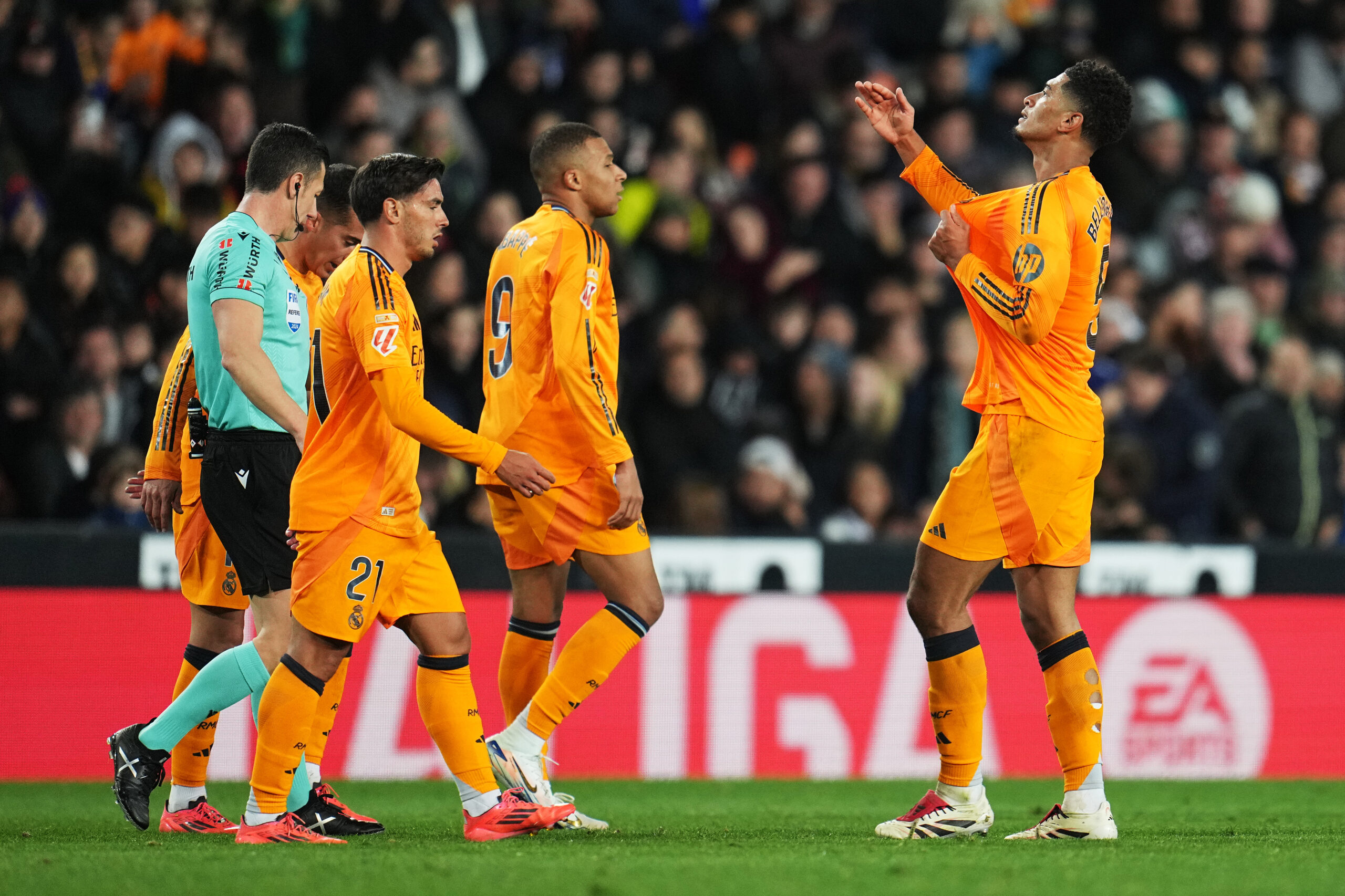 VALENCIA, SPAIN - JANUARY 03: Jude Bellingham of Real Madrid celebrates scoring his team's second goal during the LaLiga match between Valencia CF and Real Madrid CF at Estadio Mestalla on January 03, 2025 in Valencia, Spain. (Photo by Aitor Alcalde/Getty Images)