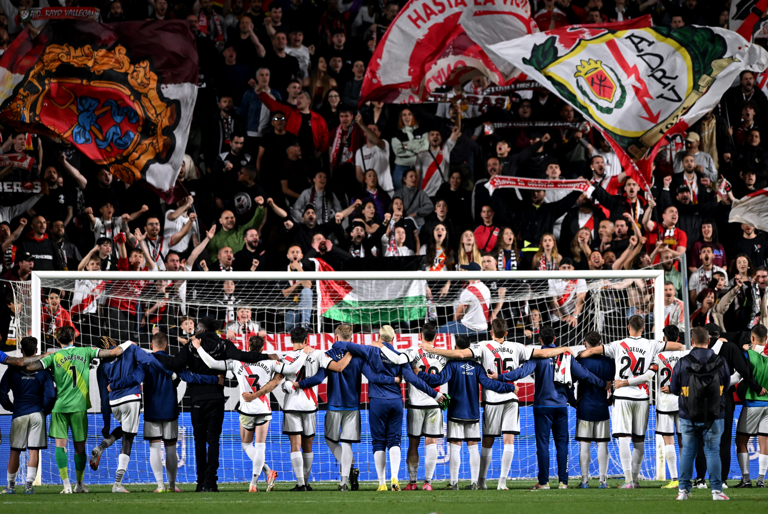 MADRID, SPAIN - MAY 02: Players of Rayo Vallecano acknowledge the fans after the LaLiga match between Rayo Vallecano and Getafe CF at Estadio de Vallecas on May 02, 2025 in Madrid, Spain. (Photo by Denis Doyle/Getty Images)