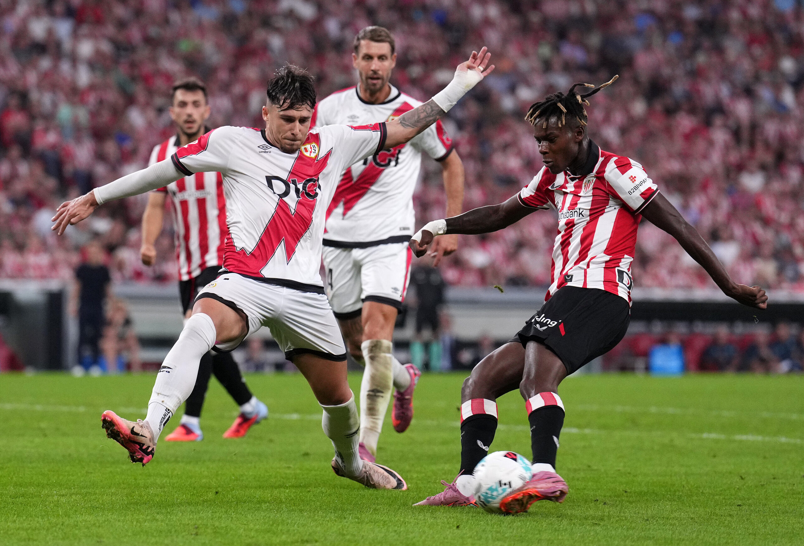 BILBAO, SPAIN - AUGUST 25: Nico Williams of Athletic Club takes a shot whilst under pressure from Andrei Ratiu of Rayo Vallecano during the LaLiga EA Sports match between Athletic Club and Rayo Vallecano de Madrid at Estadio de San Mames on August 25, 2025 in Bilbao, Spain. (Photo by Juan Manuel Serrano Arce/Getty Images)