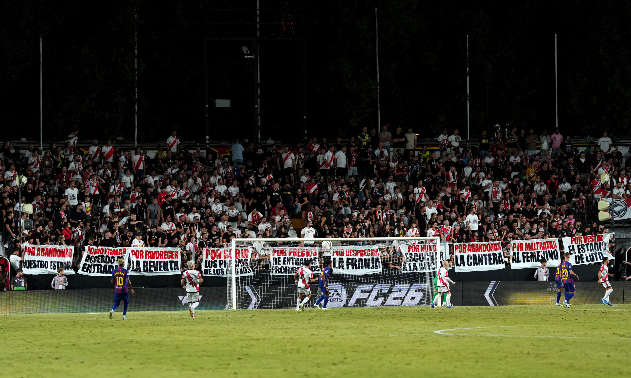 MADRID, SPAIN - AUGUST 31: Fans of Rayo Vallecano protest against the club owner during the LaLiga EA Sports match between Rayo Vallecano de Madrid and FC Barcelona at Estadio de Vallecas on August 31, 2025 in Madrid, Spain. (Photo by Angel Martinez/Getty Images)